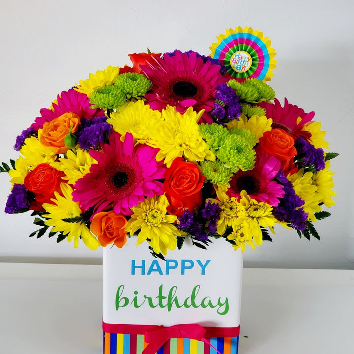 Celebrate birthdays with a burst of color and joy! This lively arrangement brings vibrant blooms that brighten any party and spread happiness. Perfect for making birthday wishes extra special, its playful charm adds fun and cheer to every celebration.