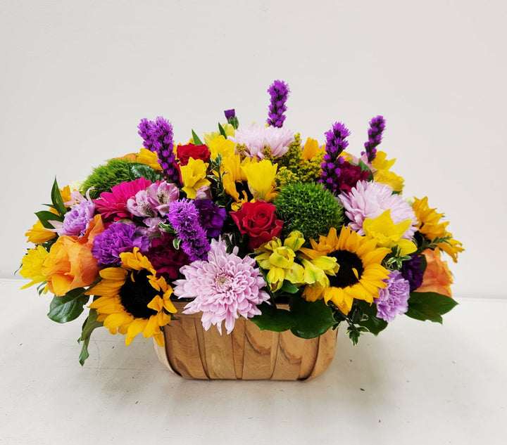Sunshine in a basket! This cheerful arrangement bursts with personality, featuring bold sunflowers and sunny yellow roses that instantly brighten any room. Pink mums add a playful pop of color, while liatris brings height and movement. Green dianthus keeps things fresh and interesting, and a whisper of lavender carnations adds a sophisticated twist. Perfect for spreading smiles and good vibes.