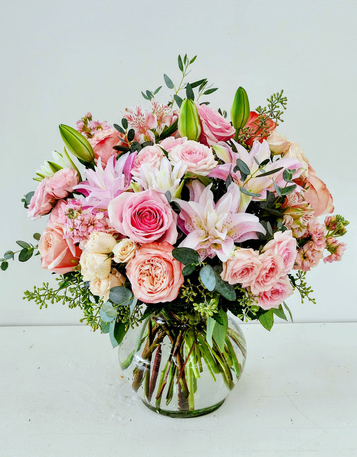 Soft pastel blooms nestled in a charming glass bubble bowl—a delightful centerpiece that brings effortless elegance to any room. Each arrangement captures a playful mix of gentle colors and fresh florals, perfect for brightening your space with understated sophistication. A joyful gift or personal indulgence that celebrates the beauty of simplicity.