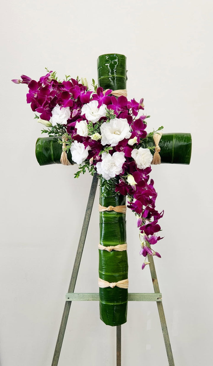 Honor a life well-lived with this striking floral cross. Lush green ti leaves form the foundation, bound together with natural raffia for an earthy, organic touch. Purple dendrobium orchids cascade gracefully across the face, creating a stunning focal point that speaks to beauty, strength, and eternal remembrance. A meaningful tribute perfect for celebrations of life and cherished memories.