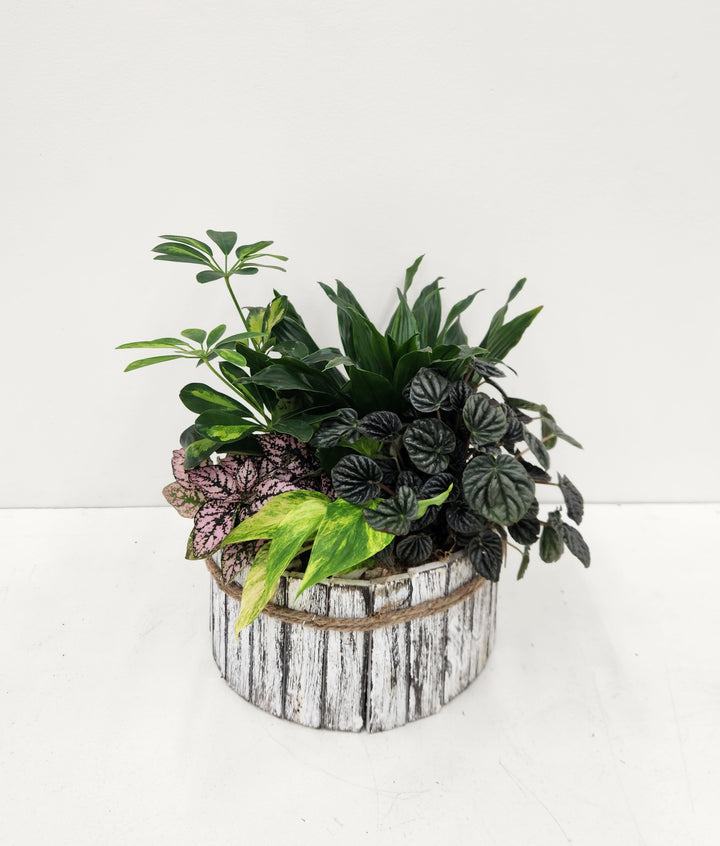 Nature's Patch brings living elegance to any space with a curated selection of verdant and colored foliage arranged in a rustic round wooden vessel. This sophisticated dish garden celebrates the subtle artistry of botanical composition, layering textures and hues to create a dynamic, ever-evolving display. A timeless gift for the discerning plant enthusiast.