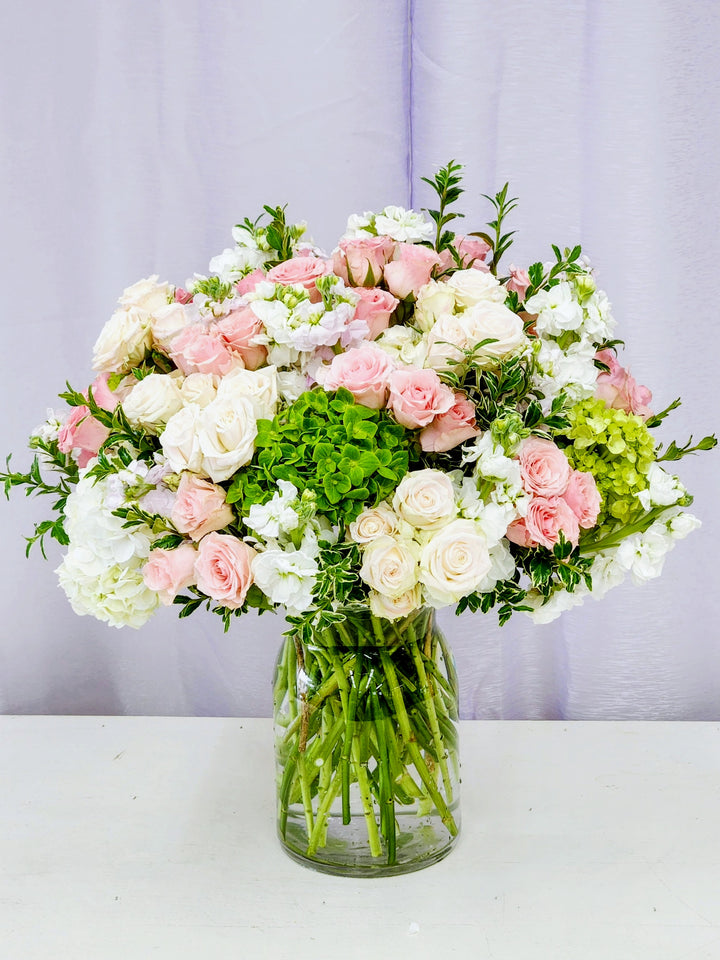 Bring calm and charm to any space with our Soothing arrangement—a delightful mix of green and white hydrangeas paired with soft pink and white blooms, all nestled in a crystal-clear vase. This cheerful composition strikes the perfect balance between serene and spirited, making it ideal for brightening someone's day or adding a gentle pop of color to your home. Fresh, elegant, and oh-so-easy on the eyes.