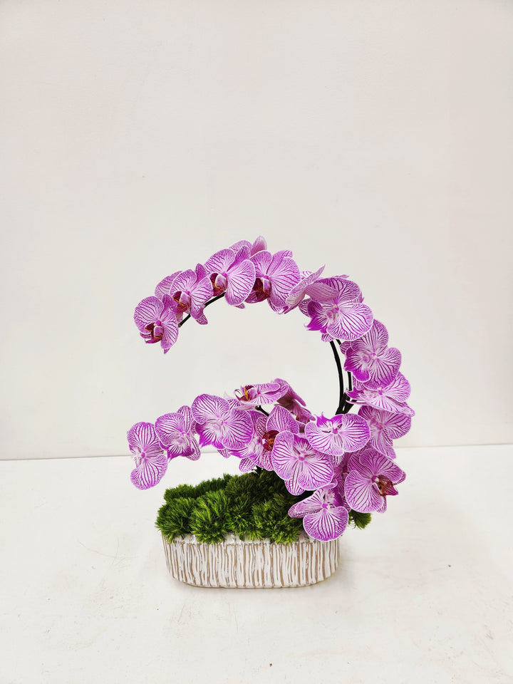 Discover understated elegance with Zen Vibes, a striking phalaenopsis orchid arrangement featuring dual layers of bicolor blooms gracefully positioned in a low ceramic vessel. Each piece is meticulously handcrafted to deliver a distinctive botanical statement—a refin Tall ed gift for those who appreciate modern minimalism and natural artistry. Perfect for adding serene sophistication to any space. Please allow 2 days for delivery. One Size only, 10" Wide by 12" Tall.